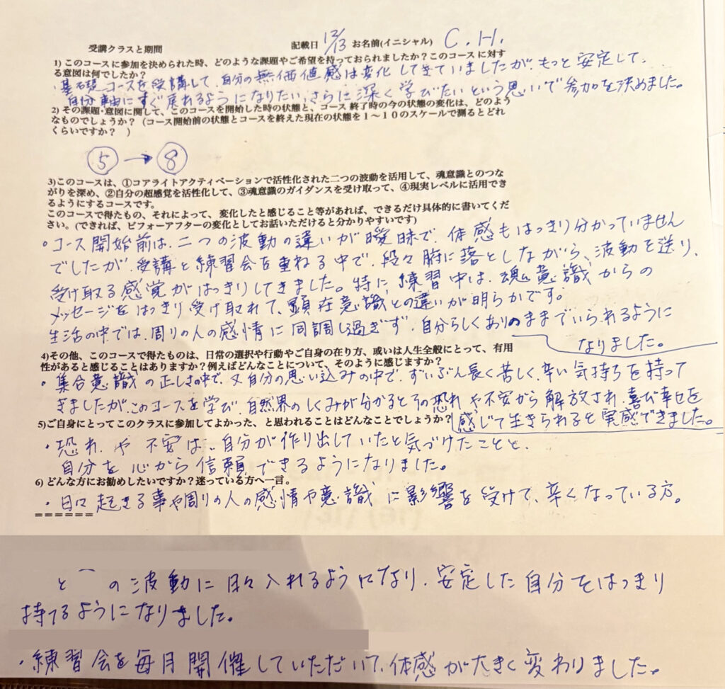 コアライトアクティベーションI 講座:H.M.様、記載日:3/17/2025