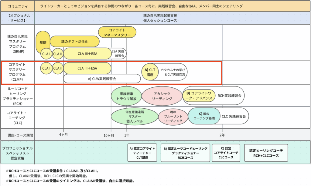 上の図は、ルミナクリエイションが提供する講座・コースの全体図です。本ページで説明しているのは、上記の青色で囲った部分(コアライトマスタリープログラム)についてです。