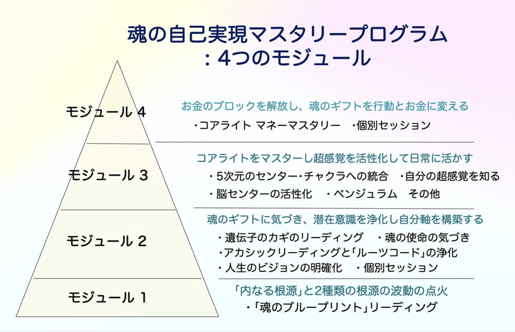 このプログラムは、①「内なる根源」とのつながりという「基礎つくり」から始まり、②「問題の根本原因(ルーツコード)の浄化」と「魂のギフトの覚醒」、③「超感覚の活性化」、そして、④「経済的な豊かさの実現」へと続く、4つの段階で構成された体系的なプログラムです 。